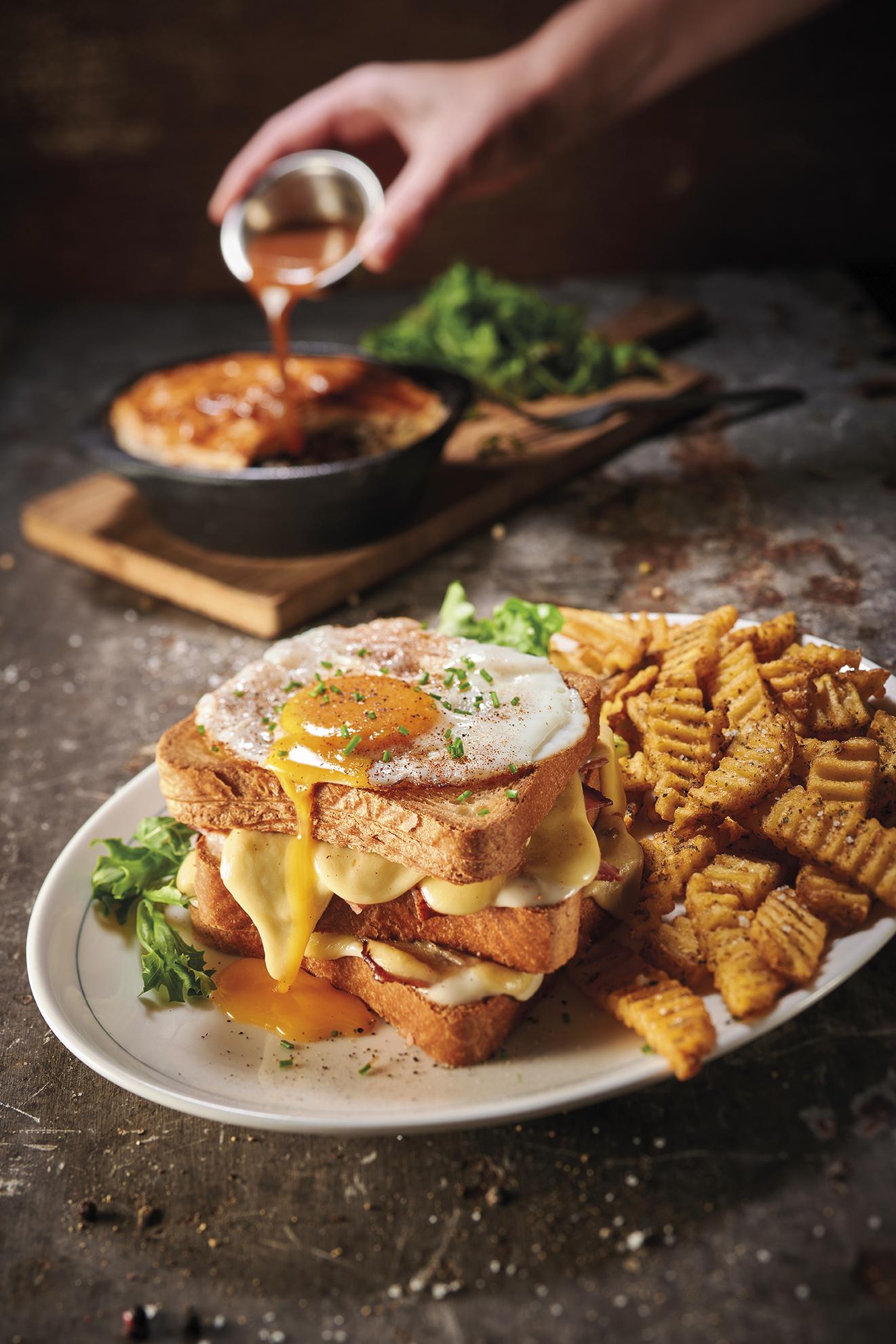 Le Croque Montagnard fondant et fumé, avec sa poitrine grillée et sa fondue aux trois fromages.